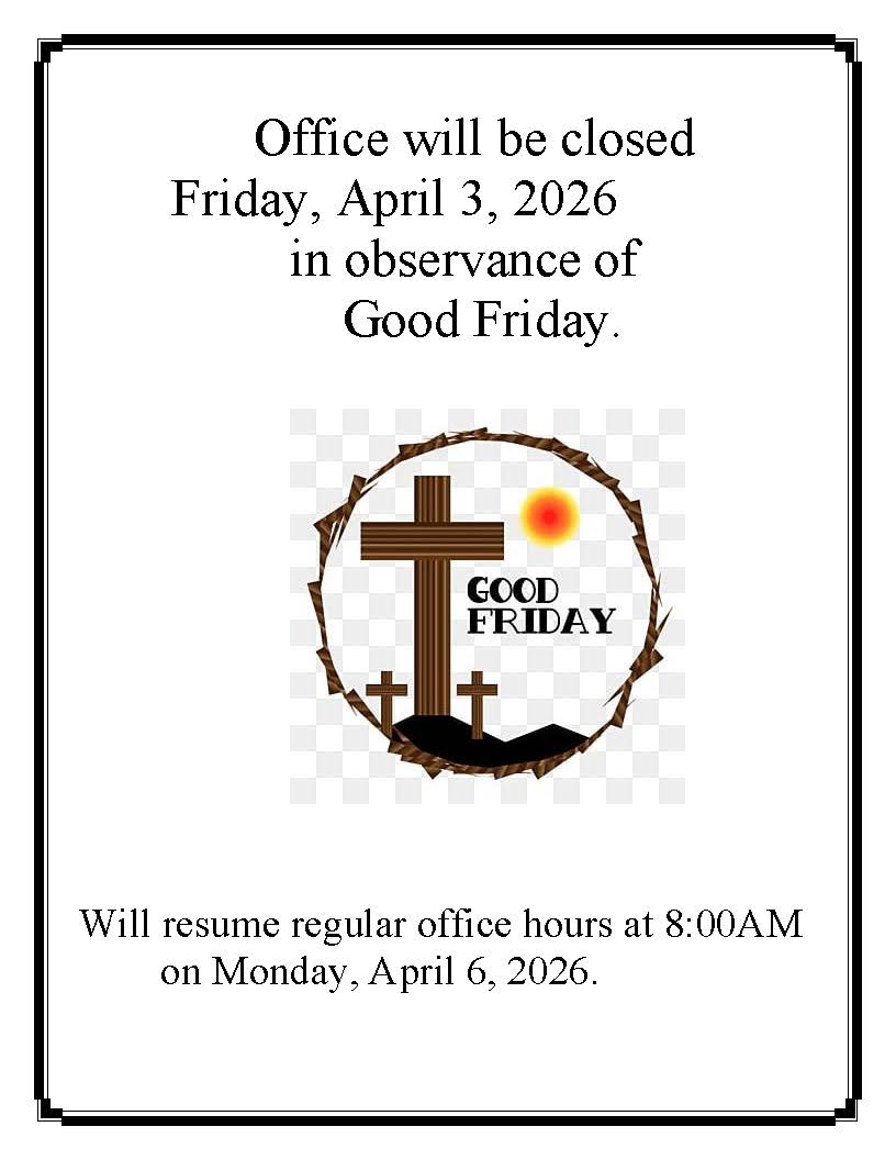 - Friday, April 3, 2026 — Good Friday — OFFICE CLOSED
